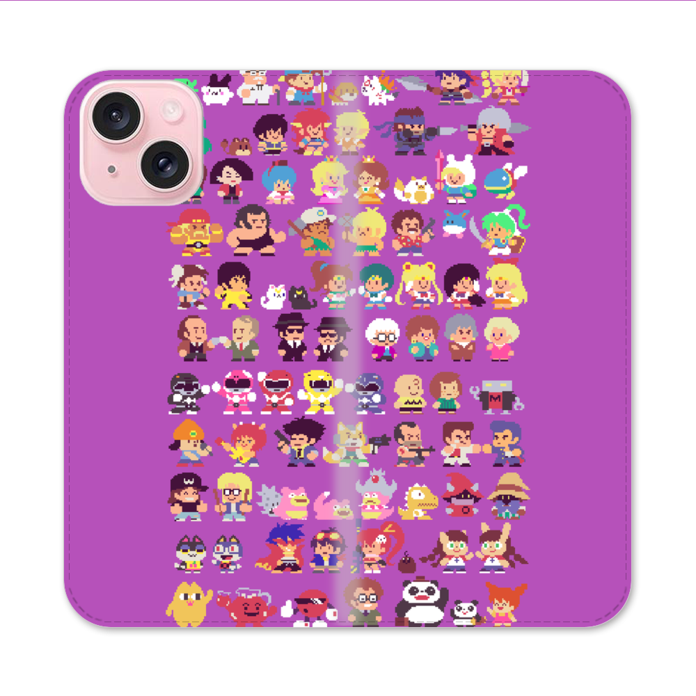 Verpixelte Cartoon Figuren Apple iPhone 15 Flip Case● Seitlich klappbar