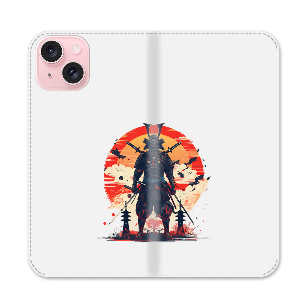 Samurai mit Hintergrund von der Sonne Apple iPhone 15 Flip Case● Seitlich klappbar