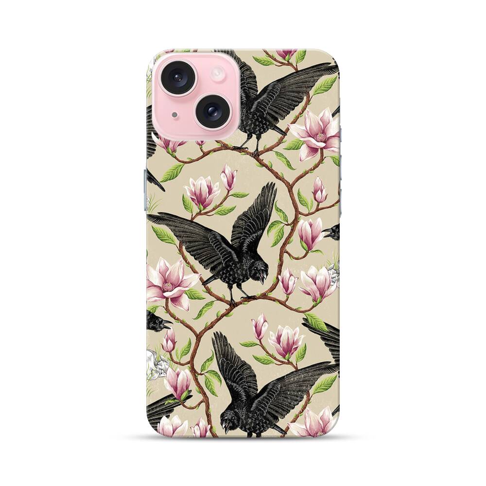 Krähen und Magnolien Apple iPhone 15 Hülle● Rundum bedruckbar