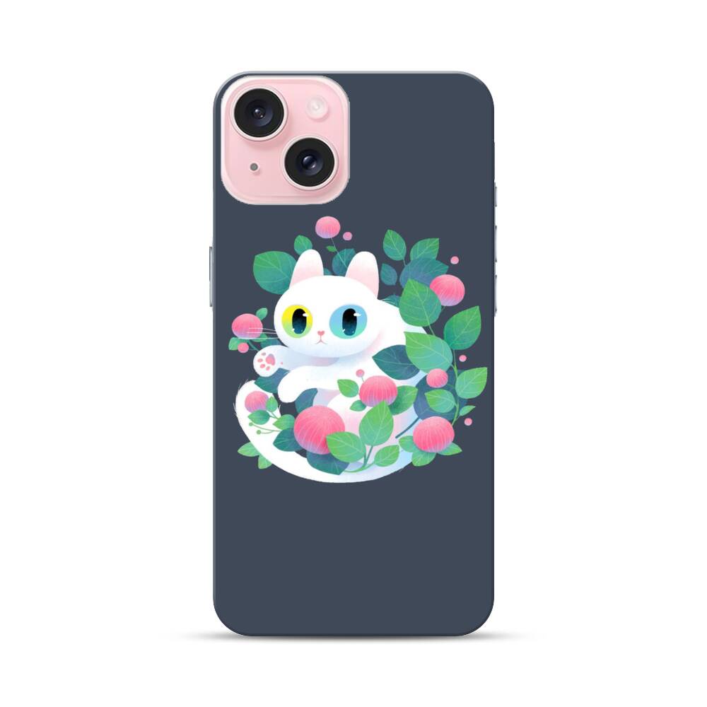 Weiße Katze mit Blumen Apple iPhone 15 Hülle● Rundum bedruckbar