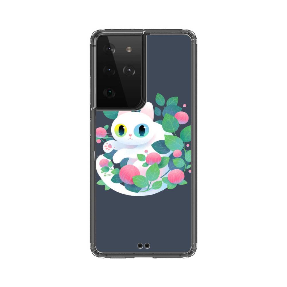 Weiße Katze mit Blumen Samsung Galaxy S21 Ultra Silikon Hülle● Sehr robust & langlebig