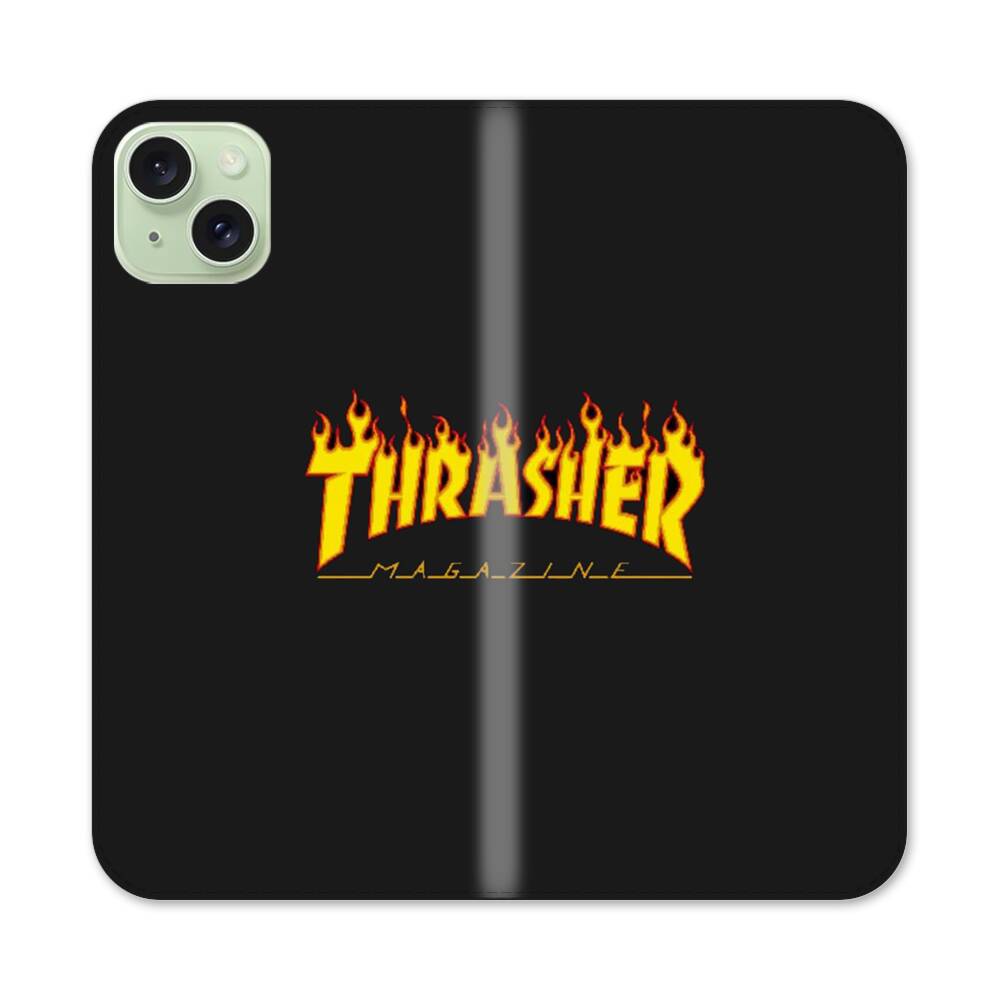 Schwarz Thrasher Logo Apple iPhone 15 Plus Flip Case● Seitlich klappbar