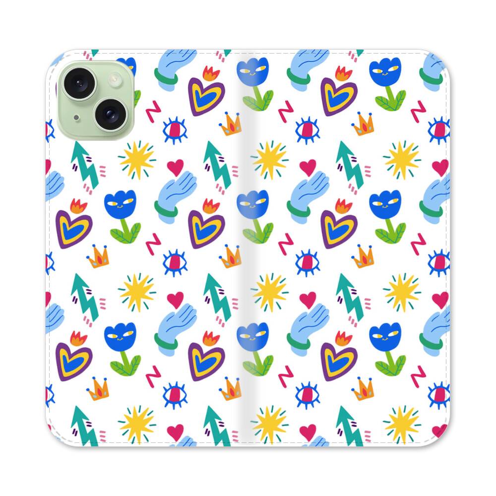 Niedliche Blumen und Herzen Graffitis Apple iPhone 15 Plus Flip Case● Seitlich klappbar