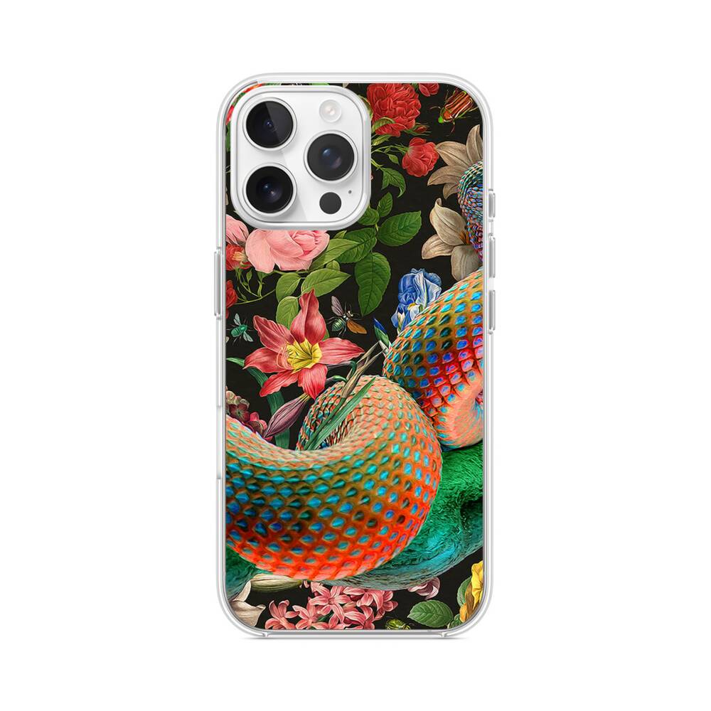 Fantasy Schlange und Blumen in dem Garten iPhone 16 Pro Max MagSafe‑kompatible Silikonhülle mit Kamera‑Kickstand● Sehr robust & langlebig