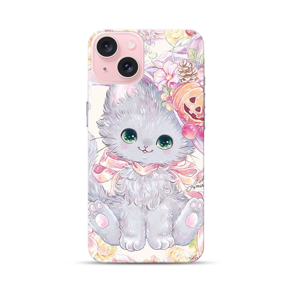 Kawaii Katze mit Kürbis Apple iPhone 15 Hülle● Rundum bedruckbar