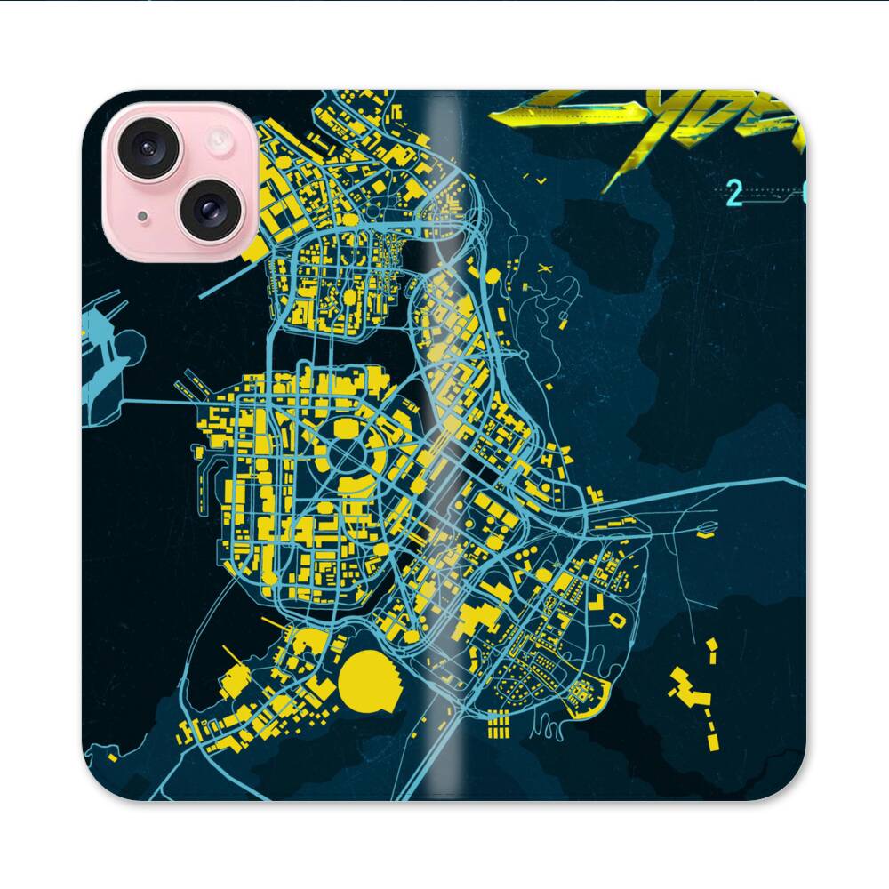 Cyberpunk Landkarte Apple iPhone 15 Flip Case● Seitlich klappbar