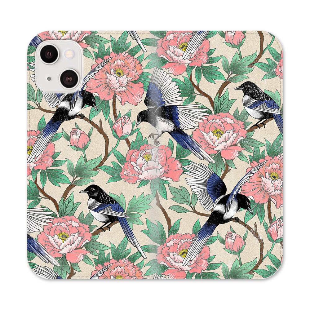 Elstern und Pfingstrosen Apple iPhone 13 Mini Flip Case● Seitlich klappbar