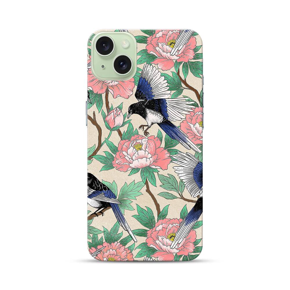 Elstern und Pfingstrosen Apple iPhone 15 Plus Hülle● Rundum bedruckbar