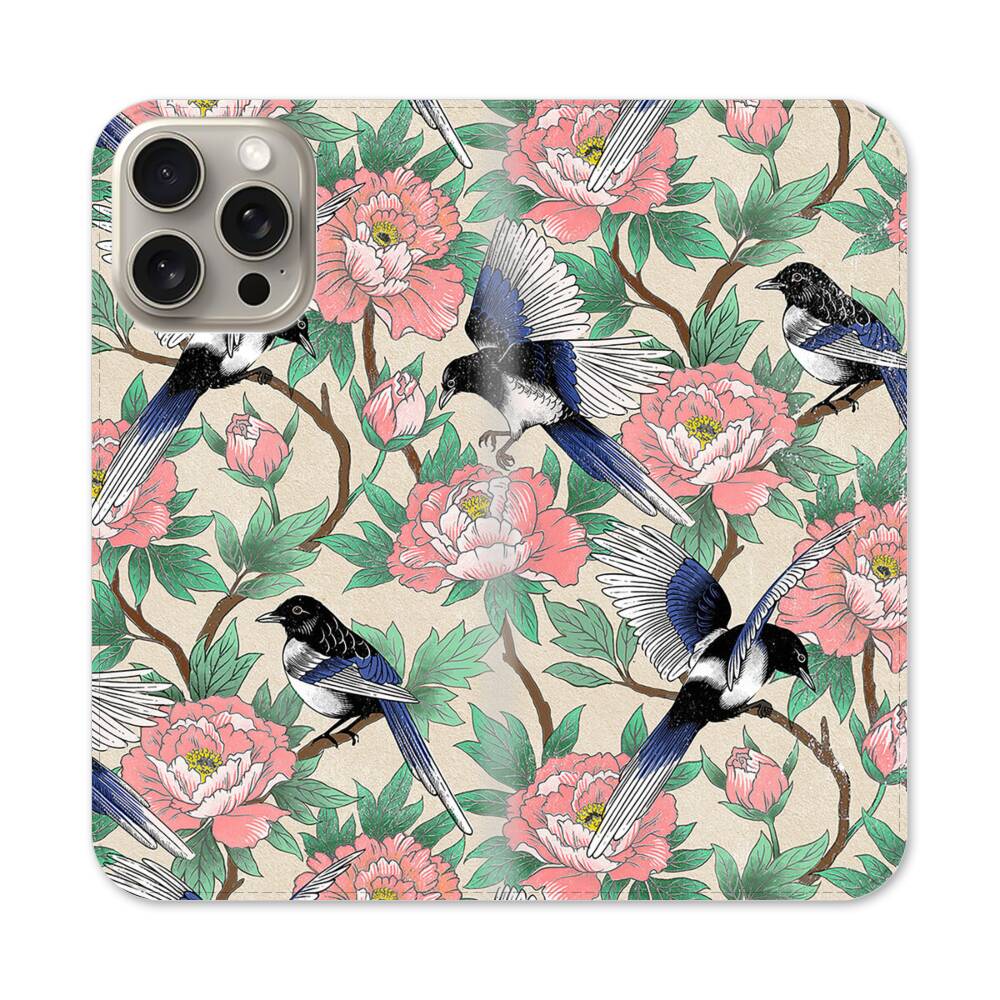 Elstern und Pfingstrosen Apple iPhone 15 Pro Max Flip Case● Seitlich klappbar