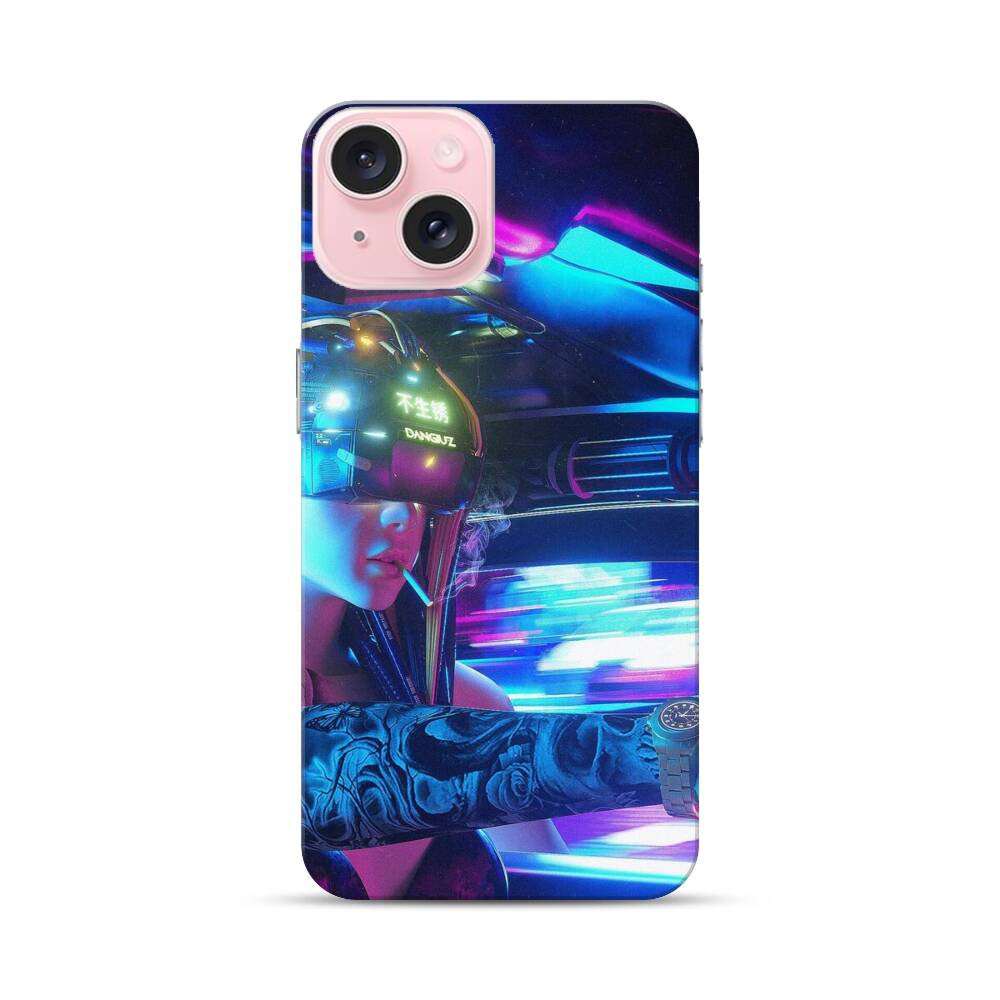 Coole Zukunftsweisende Frau Apple iPhone 15 Hülle● Rundum bedruckbar
