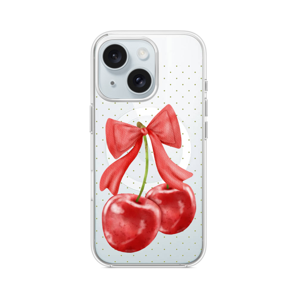 Kirsche mit Schleife iPhone 15 MagSafe‑kompatible Silikonhülle mit Kamera‑Kickstand● Sehr robust & langlebig
