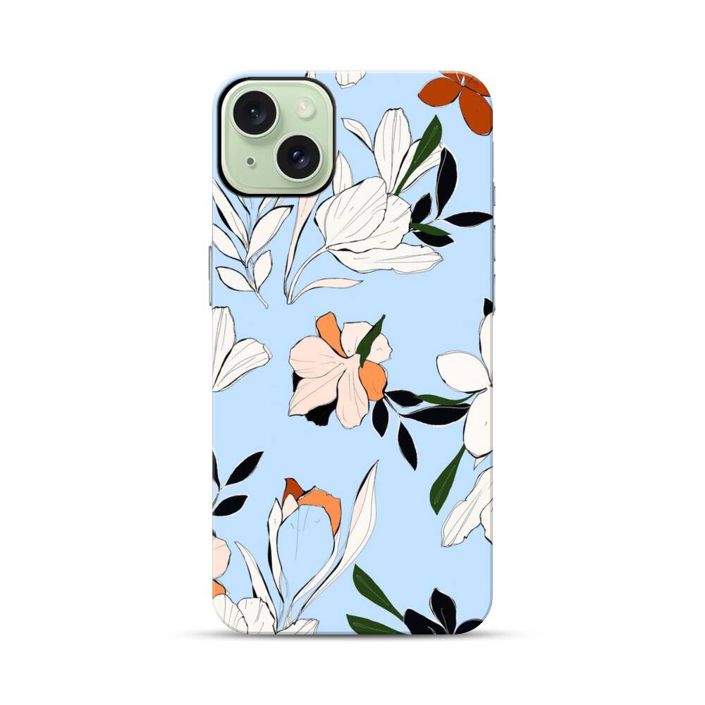Blumen im Babyblau Apple iPhone 15 Plus Hybrid Case● Rundum bedruckbar