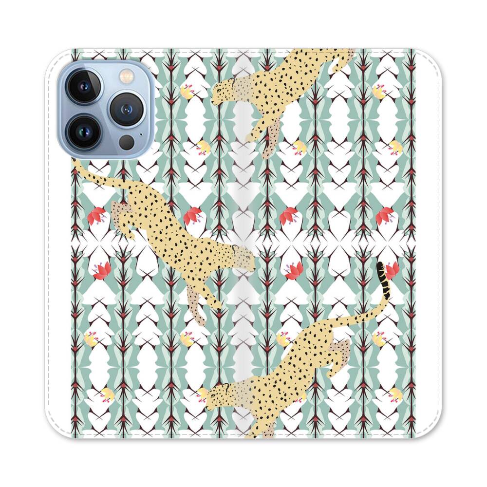 Leopard auf der Kaktusse Hintergrund Apple iPhone 13 Pro Flip Case● Seitlich klappbar
