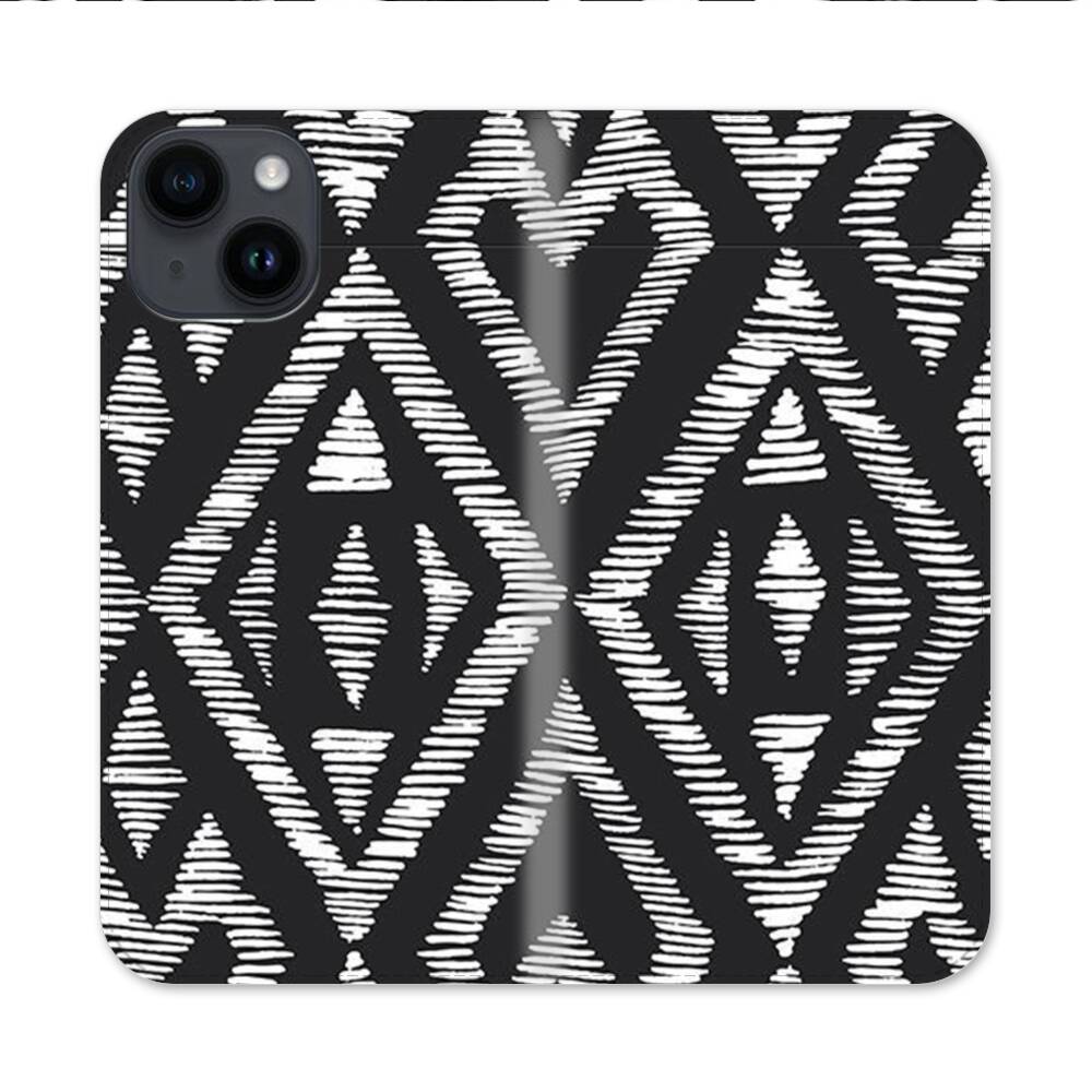 Geometrische Muster in Schwarz und Weiß Apple iPhone 14 Flip Case● Seitlich klappbar