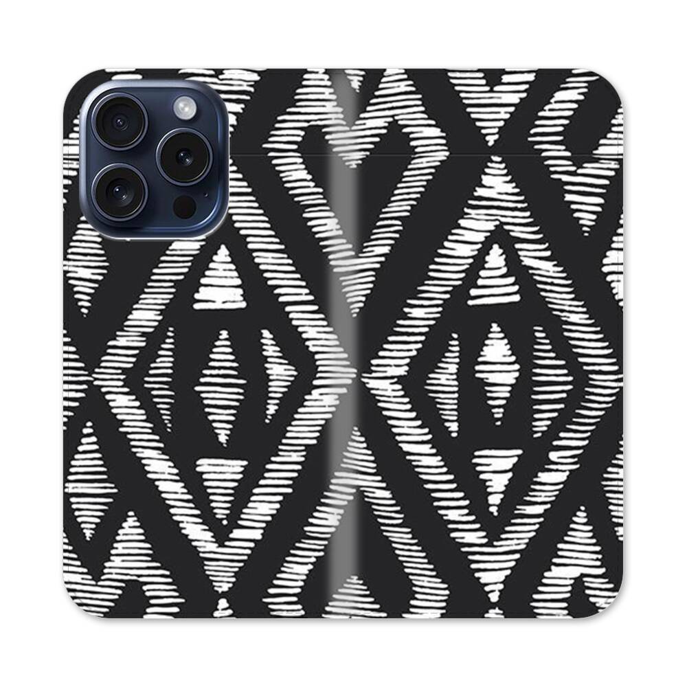 Geometrische Muster in Schwarz und Weiß Apple iPhone 15 Pro Flip Case● Seitlich klappbar