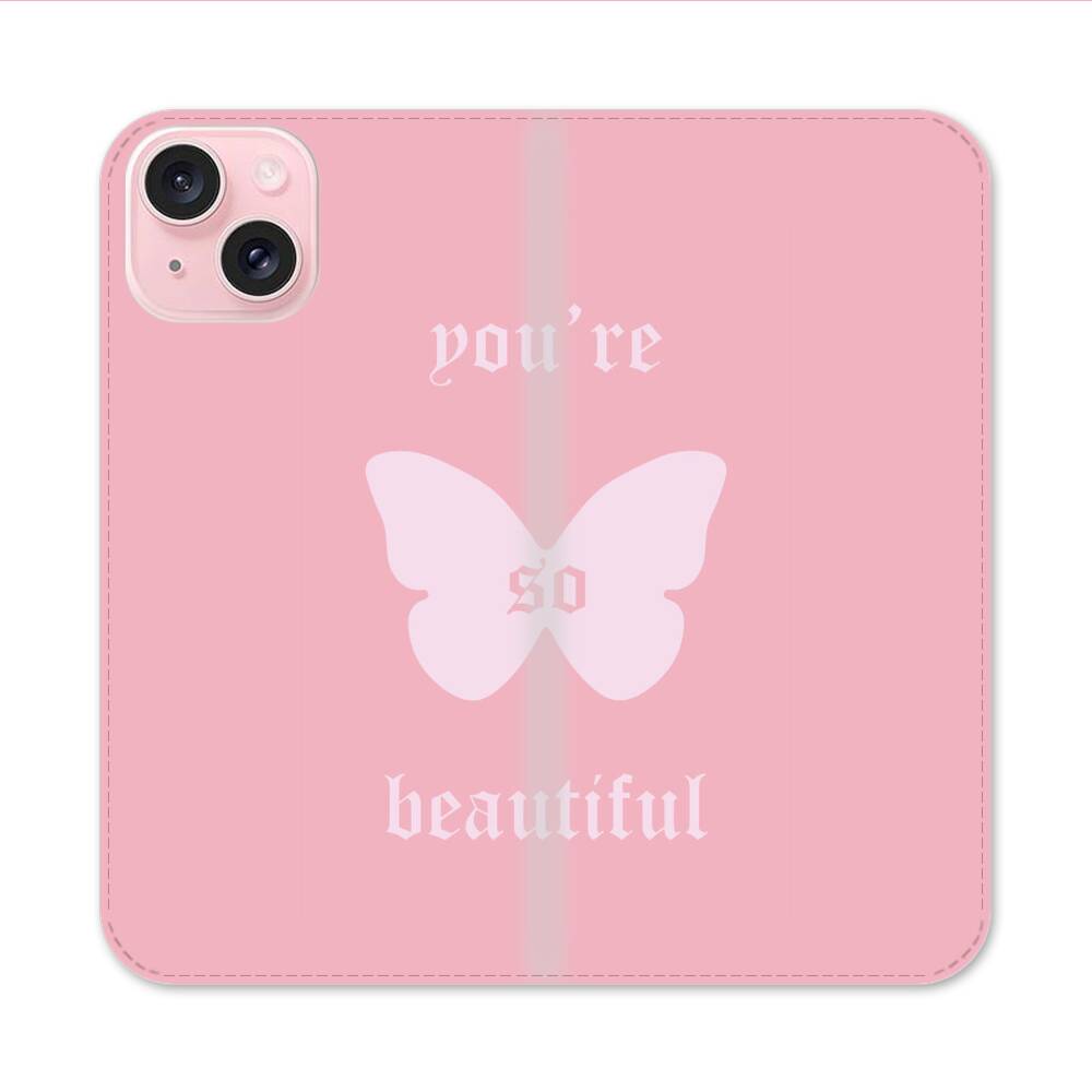 Pinker Schatten mit Schmetterling Apple iPhone 15 Flip Case● Seitlich klappbar