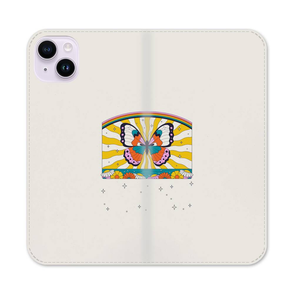 Schmetterling auf dem Regenbogen-Hintergrund Apple iPhone 14 Plus Flip Case● Seitlich klappbar