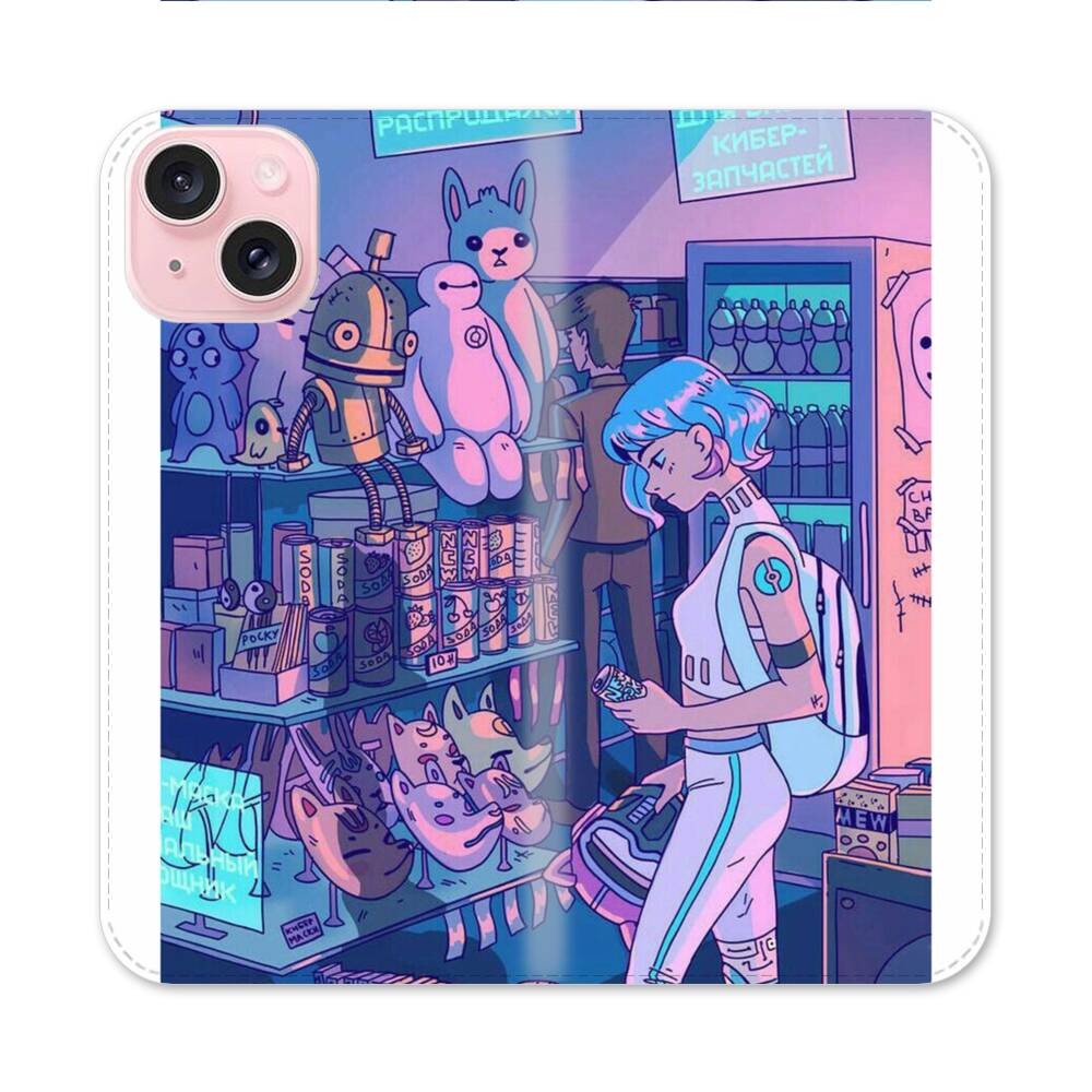 Cyberpunk Laden Apple iPhone 15 Flip Case● Seitlich klappbar