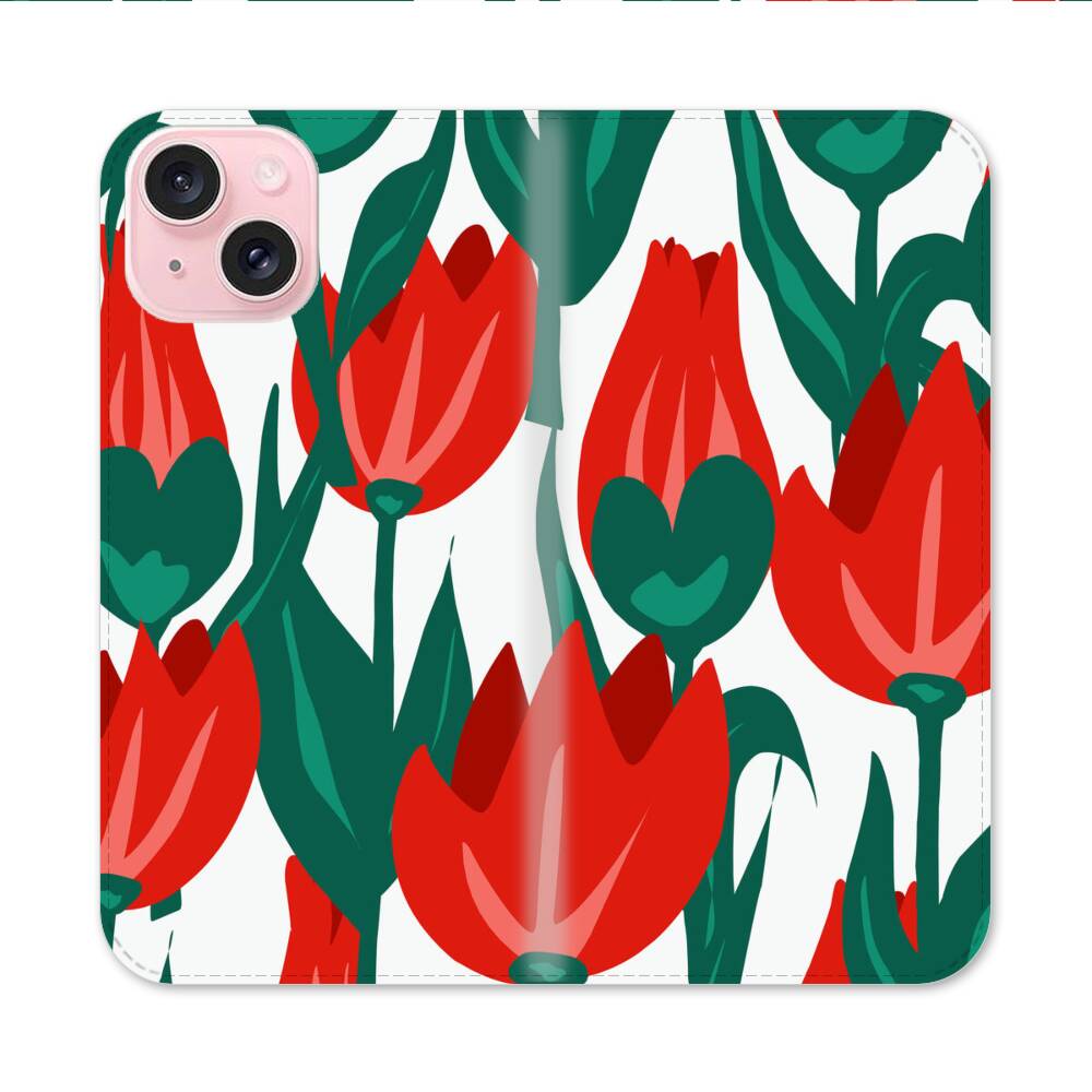Karmesinrote Tulpen Apple iPhone 15 Flip Case● Seitlich klappbar