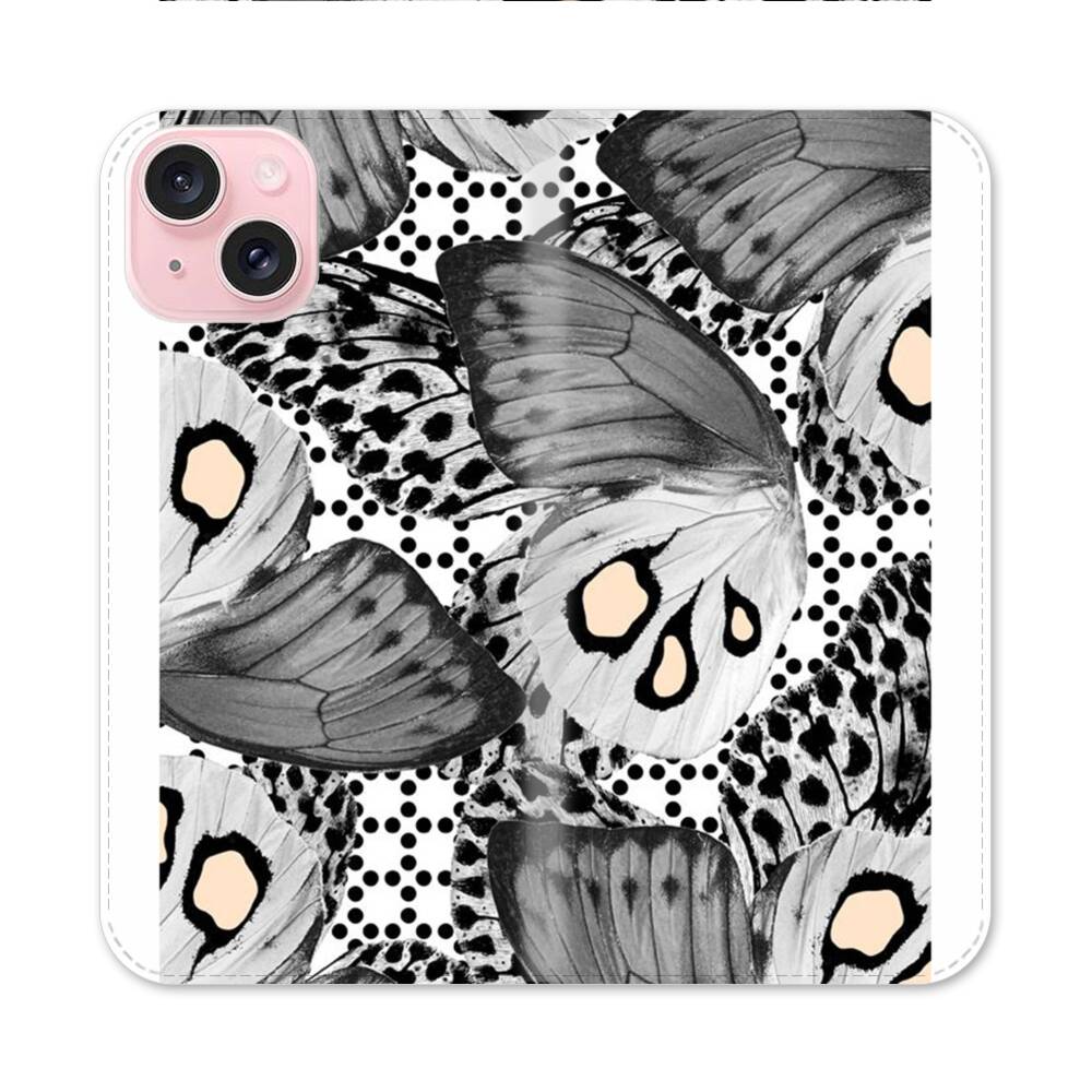 Graue Schmetterlinge Apple iPhone 15 Flip Case● Seitlich klappbar